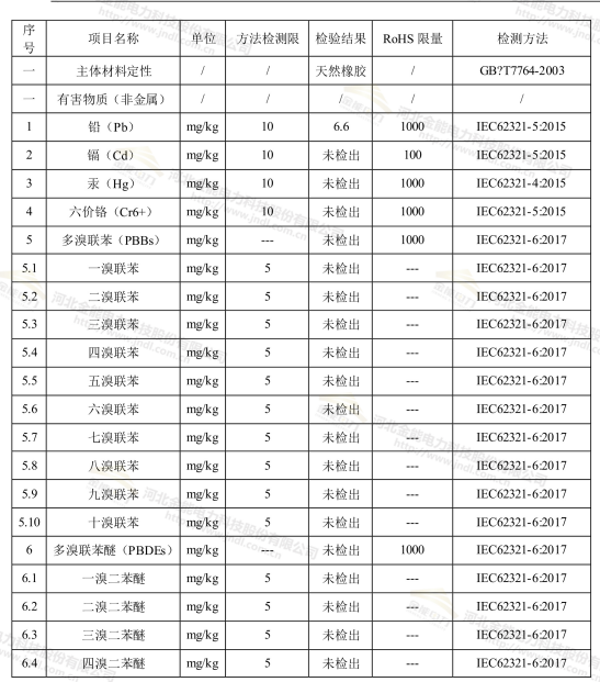 以上就是絕緣橡膠板成份檢測(cè)的事項(xiàng)了,通過(guò)檢測(cè)報(bào)表可以看出金能絕緣膠墊主材料為原生橡膠材質(zhì),鎘、汞、六價(jià)鉻、溴聯(lián)苯、多溴聯(lián)苯醚、溴二苯醚等有害物質(zhì)均沒有檢測(cè)出,證明金能電力絕緣膠墊是由原生橡膠制作,不含有害物質(zhì)的產(chǎn)品,是環(huán)保、質(zhì)量為一體的高質(zhì)量產(chǎn)品!