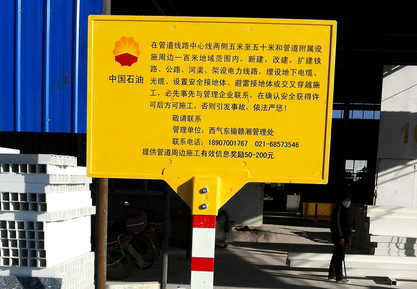 上圖為金能電力設(shè)備有限公司專門為中國石油天然氣股份有限公司西氣東輸工程制作的復(fù)合材料標(biāo)志牌。