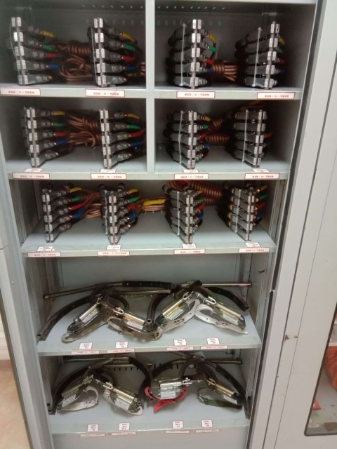 上面一組安全工具柜的存儲(chǔ)則是簡(jiǎn)單暴力,兩層接地線,分別由支架固定,其中低層兩邊也分別放兩排。整體看起來(lái)整體規(guī)范,具有較強(qiáng)的視覺(jué)沖擊。